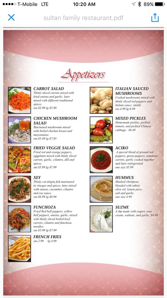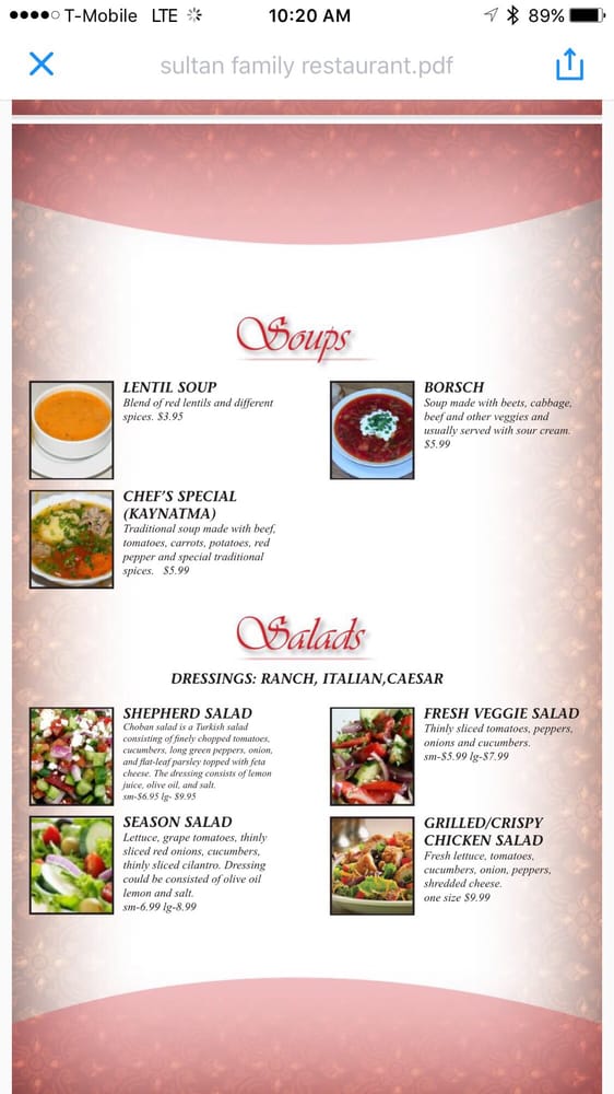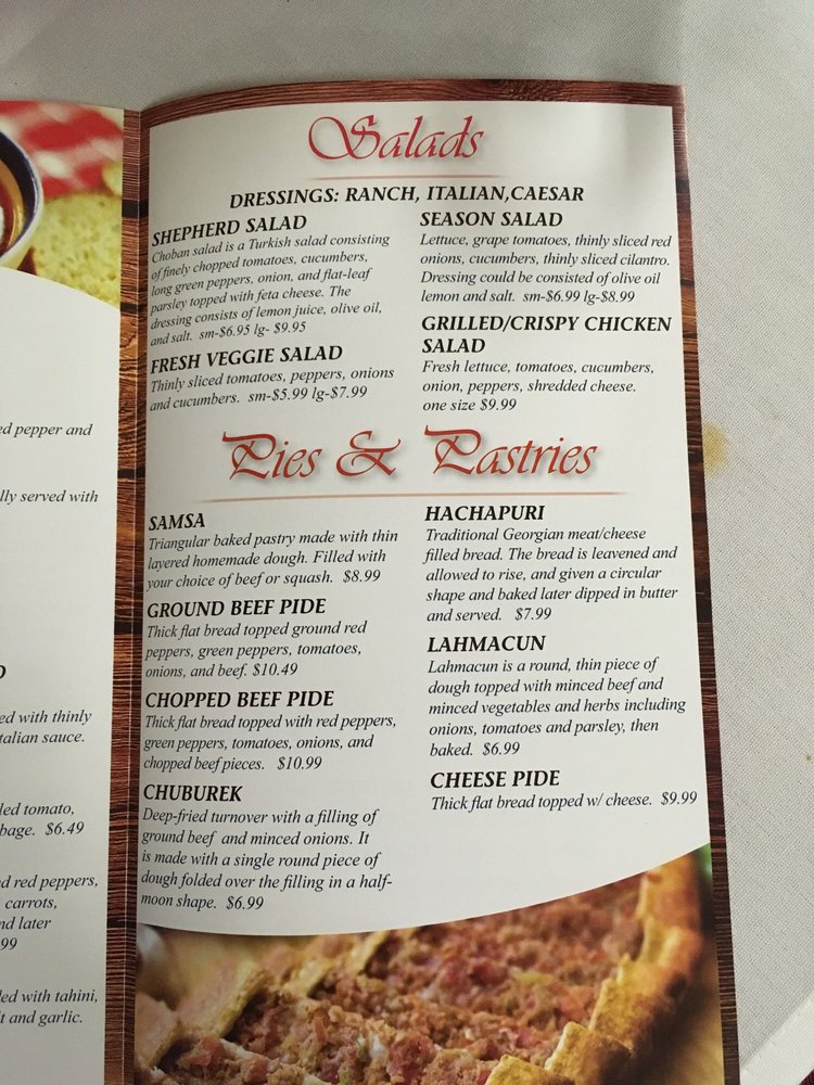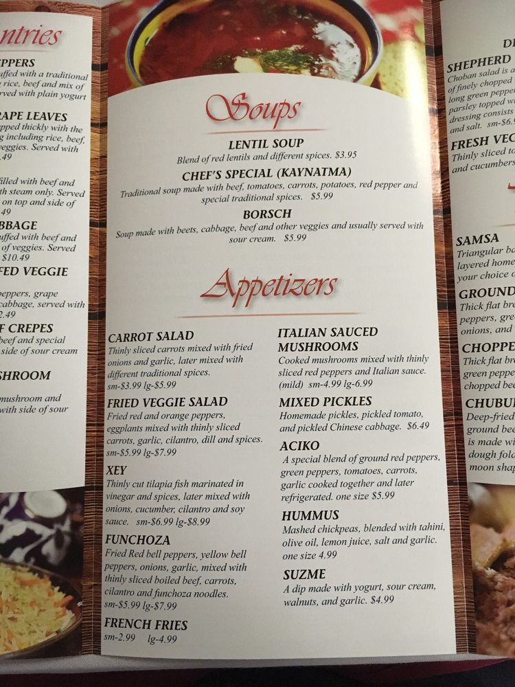 Introducing the menu at Sultan Family Restaurant, a fusion of Russian, Uzbek, and Turkish cuisine, located in Agawam, MA. From traditional appetizers like Carrot Salad, Xey, and Hummus to hearty soups including Lentil Soup and Borsch, the menu offers a wide variety of flavors. Don't miss out on the flavorful salads like Shepherd Salad and Season Salad. Customer reviews rave about the delicious dishes, with highlights including the Borsch, Lamb Skewer, dumplings, and kabobs. The warm and welcoming atmosphere, friendly service, and reasonable prices make Sultan Family Restaurant a hidden gem worth trying. With a diverse range of options for appetizers, soups, and salads, Sultan Family Restaurant promises a unique dining experience with authentic flavors from different regions. Explore the menu for a taste of traditional and flavorful dishes that will leave you coming back for more.